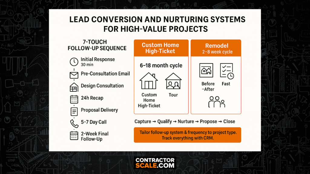 - Systematic follow-up processes for extended construction sales cycles