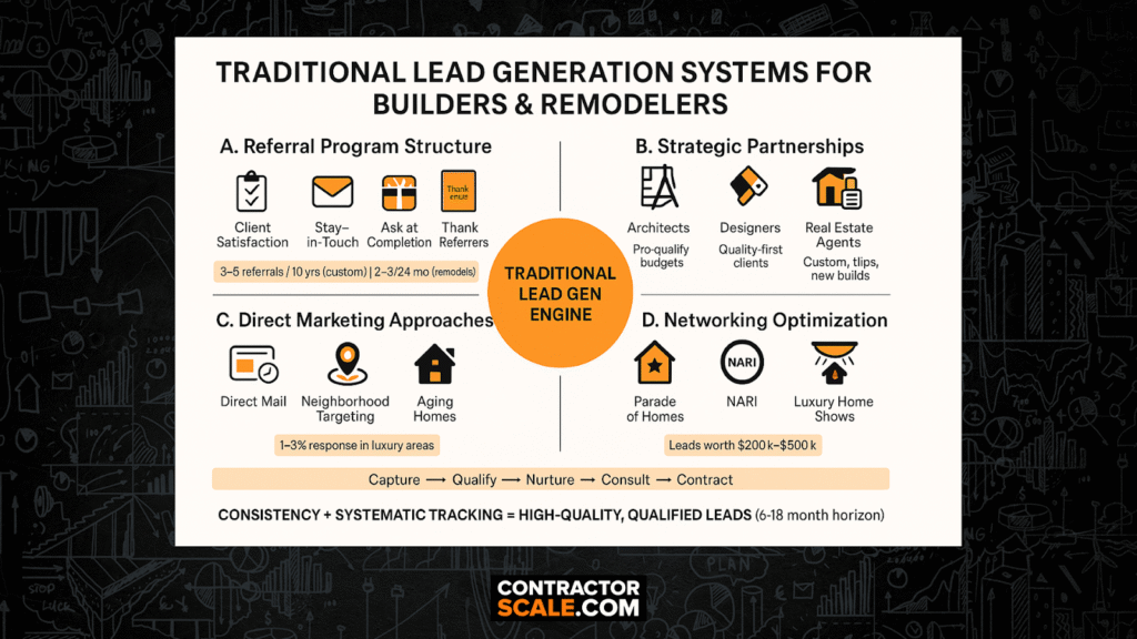 Digital marketing gets most attention today, but traditional methods still generate the highest-quality, qualified construction leads. These systems build relationships that create decades of referrals. The difference between success and failure lies in systematic execution.