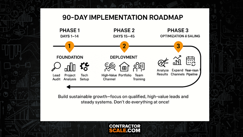 Successful construction company digital marketing implementation follows a systematic 90-day roadmap. Most builders try to launch everything simultaneously, creating chaos instead of sustainable growth. This phased approach builds momentum while maintaining construction project quality.