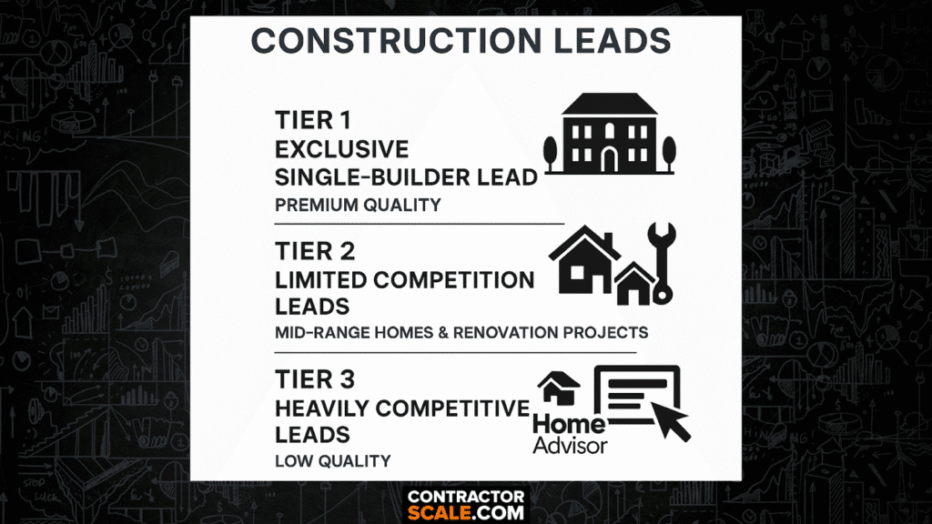 Tier 1 exclusive leads consistently outperform Tier 3 shared platform leads by 7-9 times. A $500 exclusive custom home lead converting at 80% generates far more profit than ten $50 shared leads converting at 5-10%. Focus on qualified construction leads that match your project minimums.