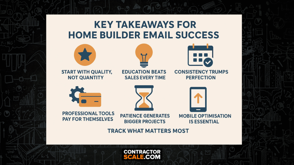 Email marketing transforms home-building businesses when done properly. The builders who master this approach generate predictable lead flows worth hundreds of thousands in annual project value. The key lies in patience, education-first content, and consistent execution over 6-12 months.