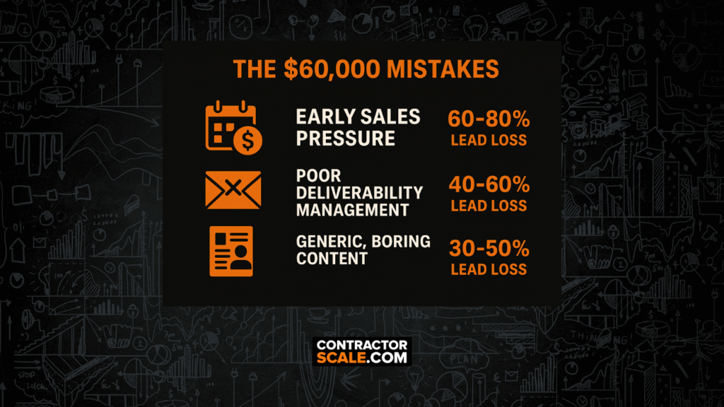 Most builders fail because they treat email like advertising—pushing sales messages too early and focusing on their own needs instead of educating homeowners. The successful ones flip this approach. They become trusted advisors first, sellers second. This builds stronger relationships, attracts higher-value projects, and creates referral engines that compound over time.
